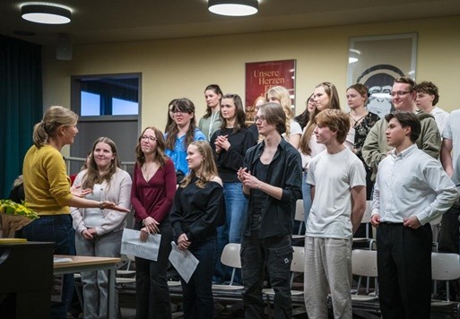 In einer „letzten Musikstunde“ sangen am 14. April der Seminarkurs Musik und einige Schülerinnen und Schüler der Grundkurse im Musikraum und blickten gemeinsam mit dem Publikum auf fünf Jahre Musikunterricht und gemeinsame Konzerte zurück.